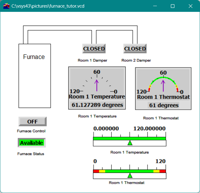 This tutorial instructs you in using Vaccess to create a simple Vsystem database to monitor and control the functions of a furnace. You will use Vdraw to create a furnace control display window and then activate it, as shown in Figure 2, by linking it to the database.